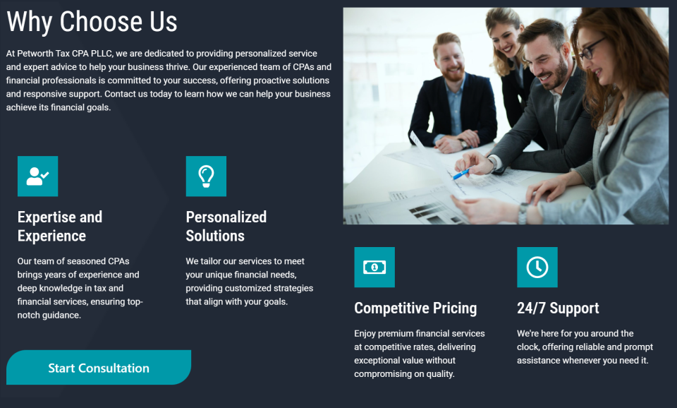 Petworth Tax CPA PLLC is a trusted and professional accounting firm dedicated to providing comprehensive financial solutions. With a team of experienced CPAs, we offer personalized services including tax preparation and filing, tax planning, retirement planning, estate planning, investment advisory, risk management, financial reporting, international tax services, small business advisory, and tax education.
